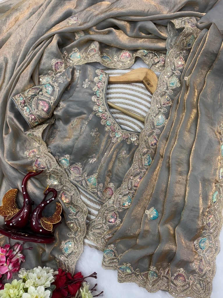 Drape yourself in elegance with this exquisite Soft Space Silk saree, crafted to radiate grace and sophistication. Adorned with dual-tone sequin and delicate dori embroidery work, the saree beautifully balances traditional artistry with a modern flair.
