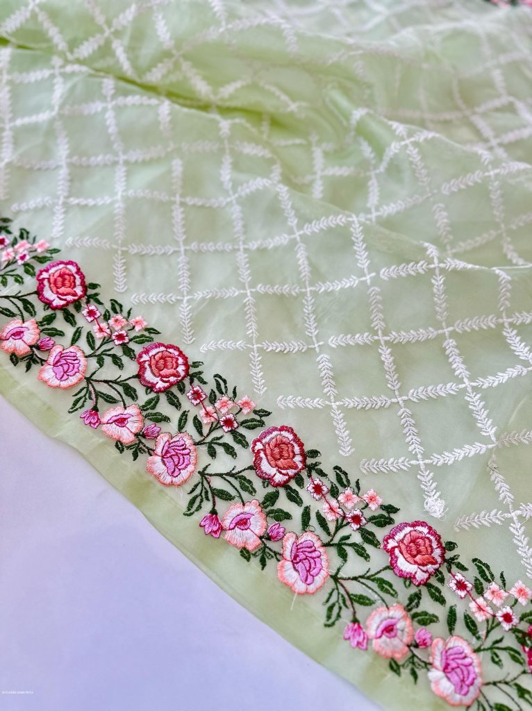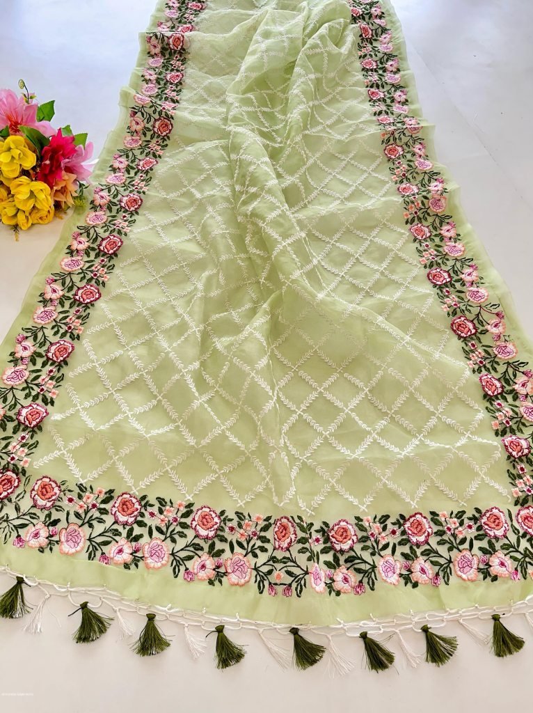 Semi pure organza saree cover with beautiful embroidery all over saree attach with latkan and plain bottel green silk blouse