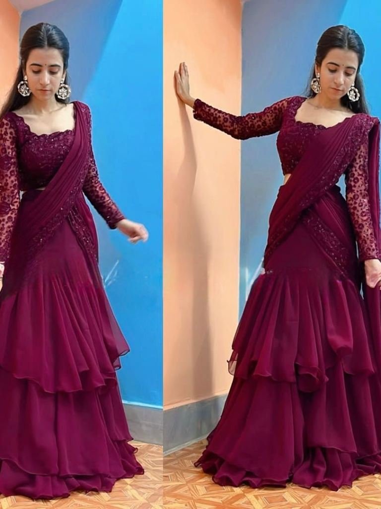 Lehenga Type : Ready to wear ruffle style up to 42 with elastic with side zip