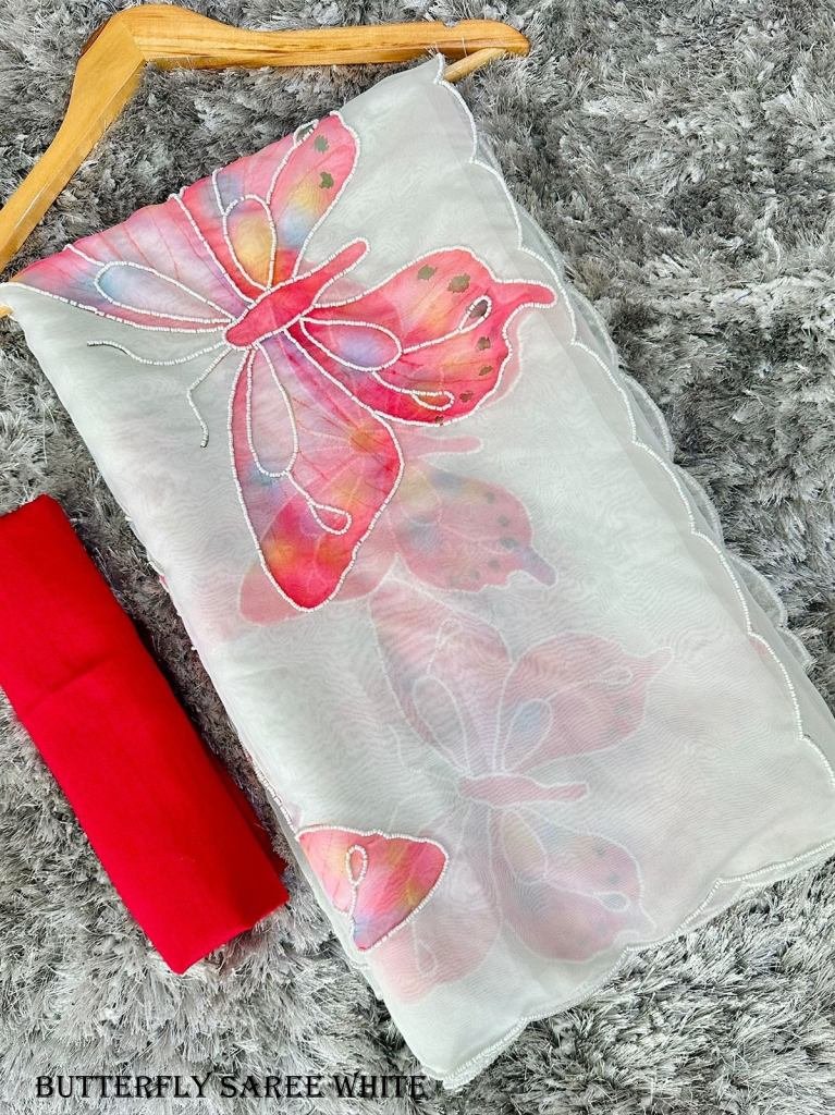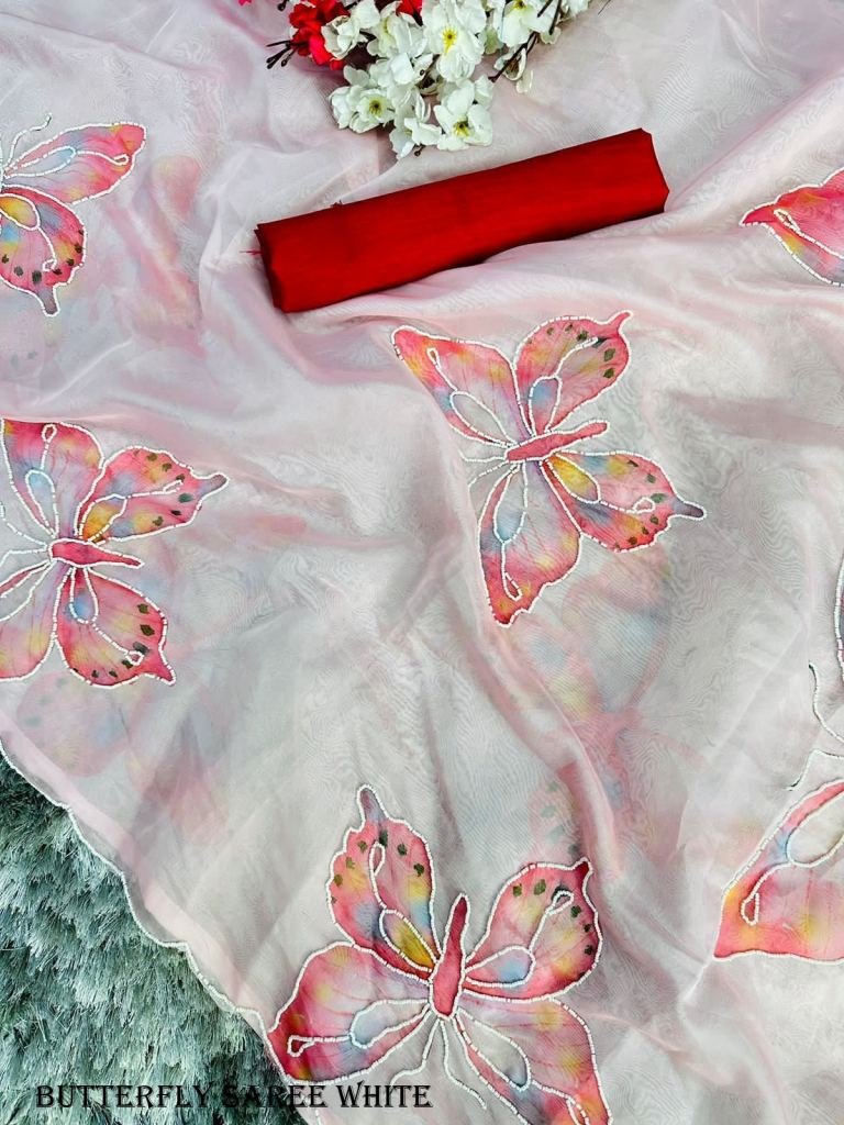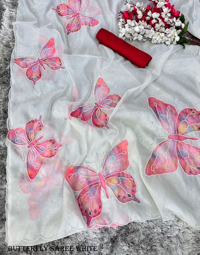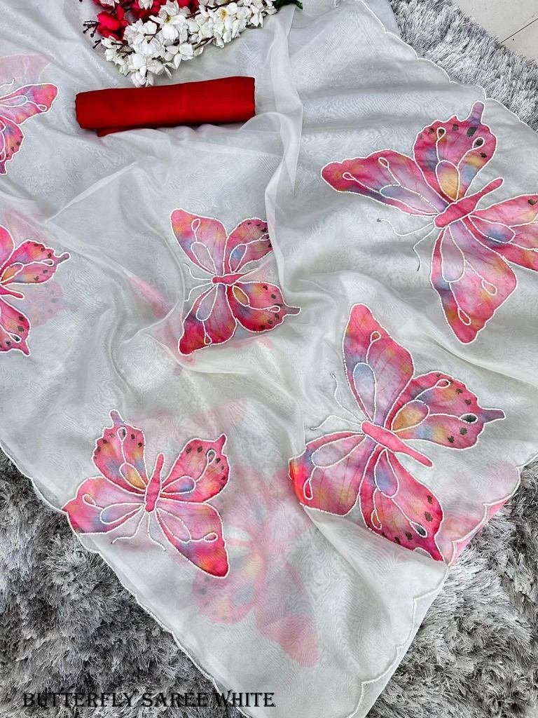 beautiful handcrafted work all over printed butterflies with handcradted pearl work border all over semi pure organza saree