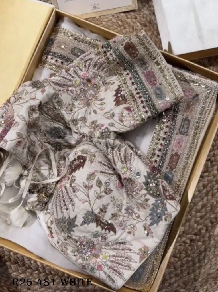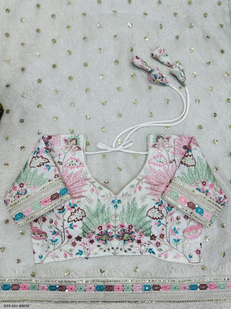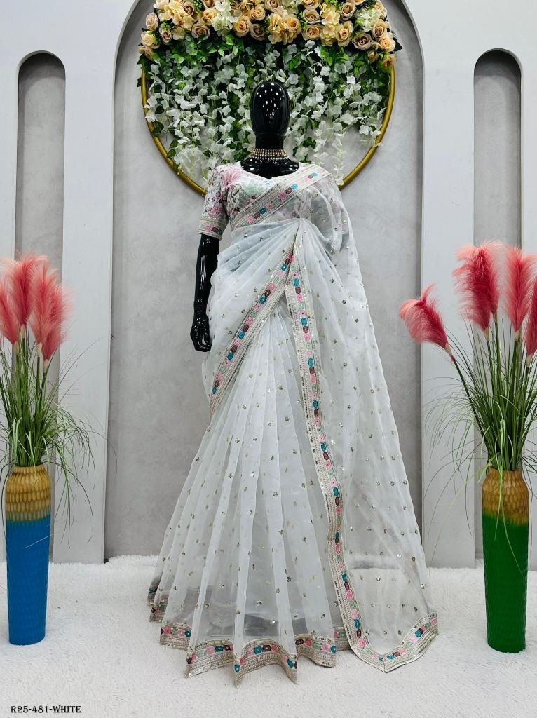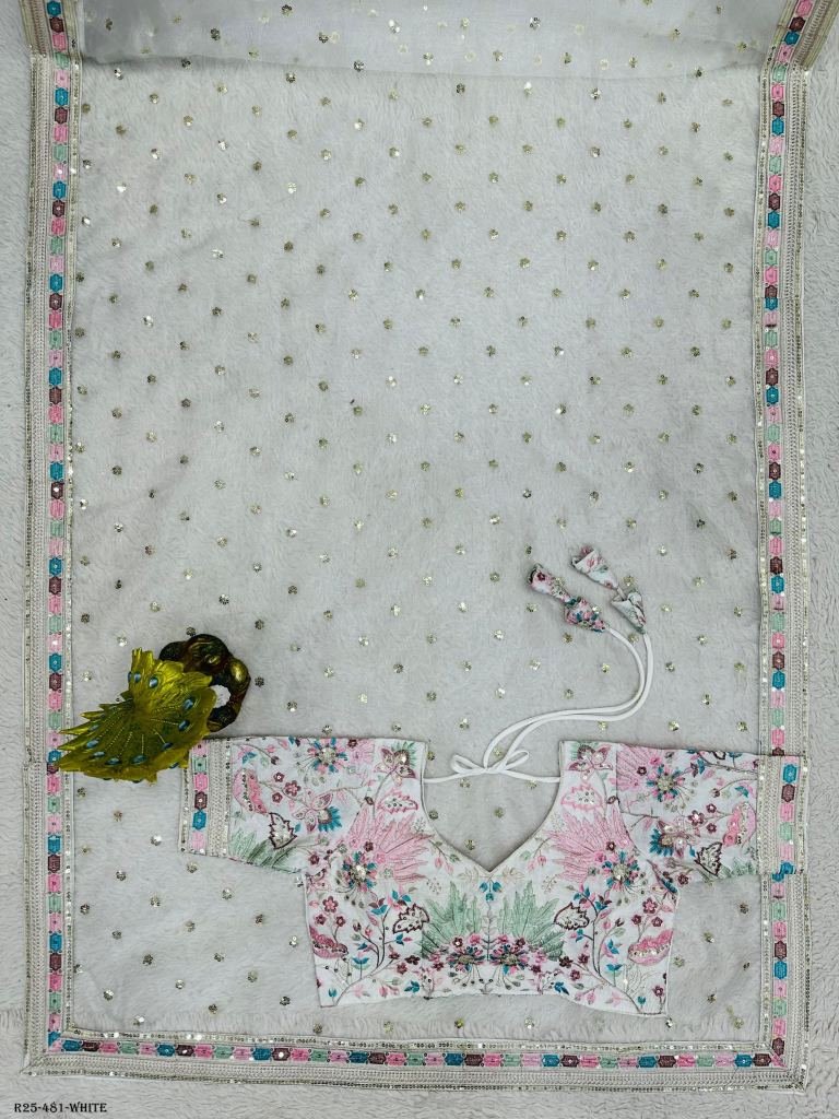 SareeFabric. :-Havy Organza Silk Work :-Thred with Sequnce workWeight :-0.850 GrmBlouseFabric. :-Mono BengloriWork :-Thred with SequnceCut . :-0.80 CM (Un-S