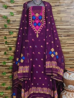 Jamdani dress material is a hand-woven material widely known for its delicate look and gentle touch. Since pure cotton is the only fabric used in it, it has quick water-absorbent quality, ideal for the sweaty summer season in India. If you want it for your textile business, buy jamdani dress material wholesale for resale in bulk from FabFunda. And if you need it to stitch a very elegant, yet stylish and comfortable ethnic outfit for yourself, choose from our wide variety of Jamdani dress material at wholesale rates. We offer jamdani dress material in different types of graceful designs, and various colors also to choose from. Contact FabFunda, India’s best Jamdani dress material wholesaler in Surat on call or WhatsApp to place your order now.