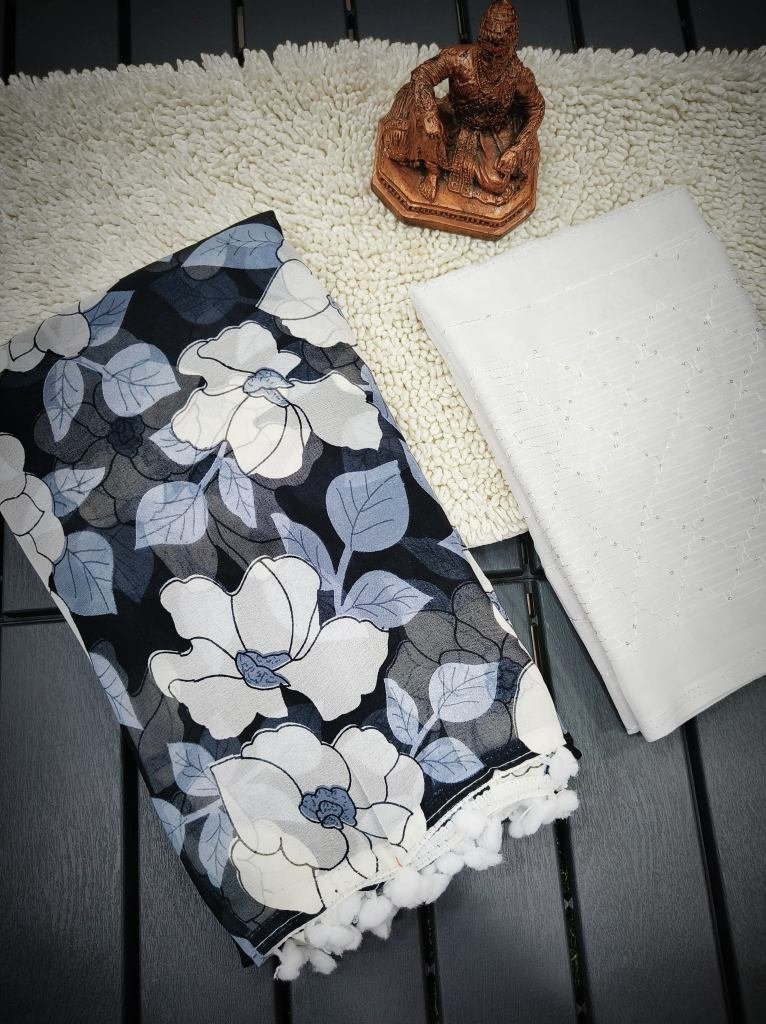 Latest releaseFabric: Faux georgette Saree with Contrast 3D sequence embroidered blouse piece and pom pom on pallu and border.Saree cut: 5/50Blouse piece: 0/80