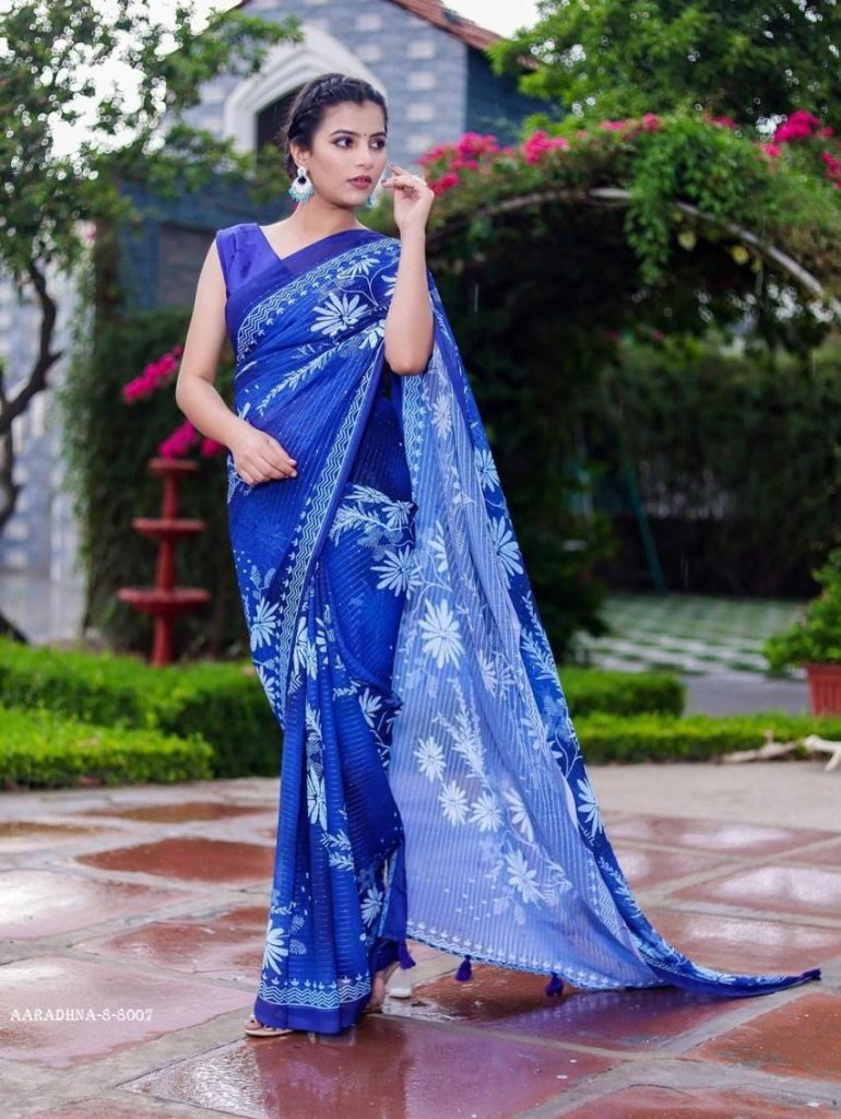 Fabrics :- Faux Georgette(5.50 Mtr.)BLOUSE :- SILK(1.00 Mtr.)WORK :- Digital Print With Heavy Sequence Crochet Embroidery Stich WorkWeight :- 1.00 KgWash :- First Time Dry Clean