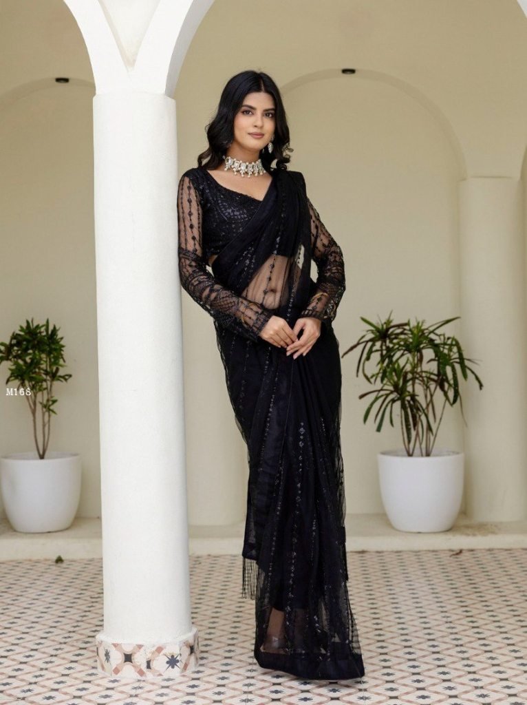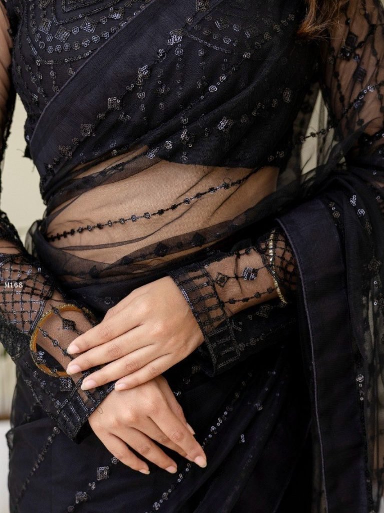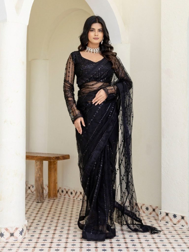 SareeFabric : Soft Mono NetWork : Sequins Thread EmbroideredLength : 5.5 Meter Blouse (Un-Stitched)Fabric : Soft Mono NetInner : Micro Cotton Size : Unstitched 1.25 Meter