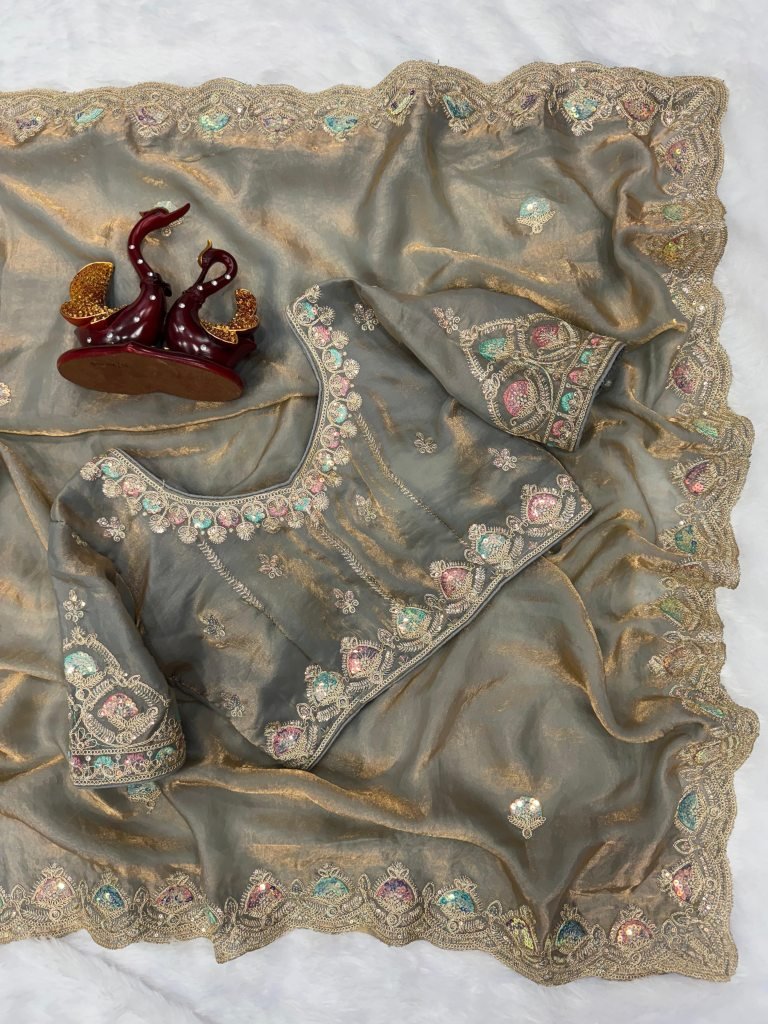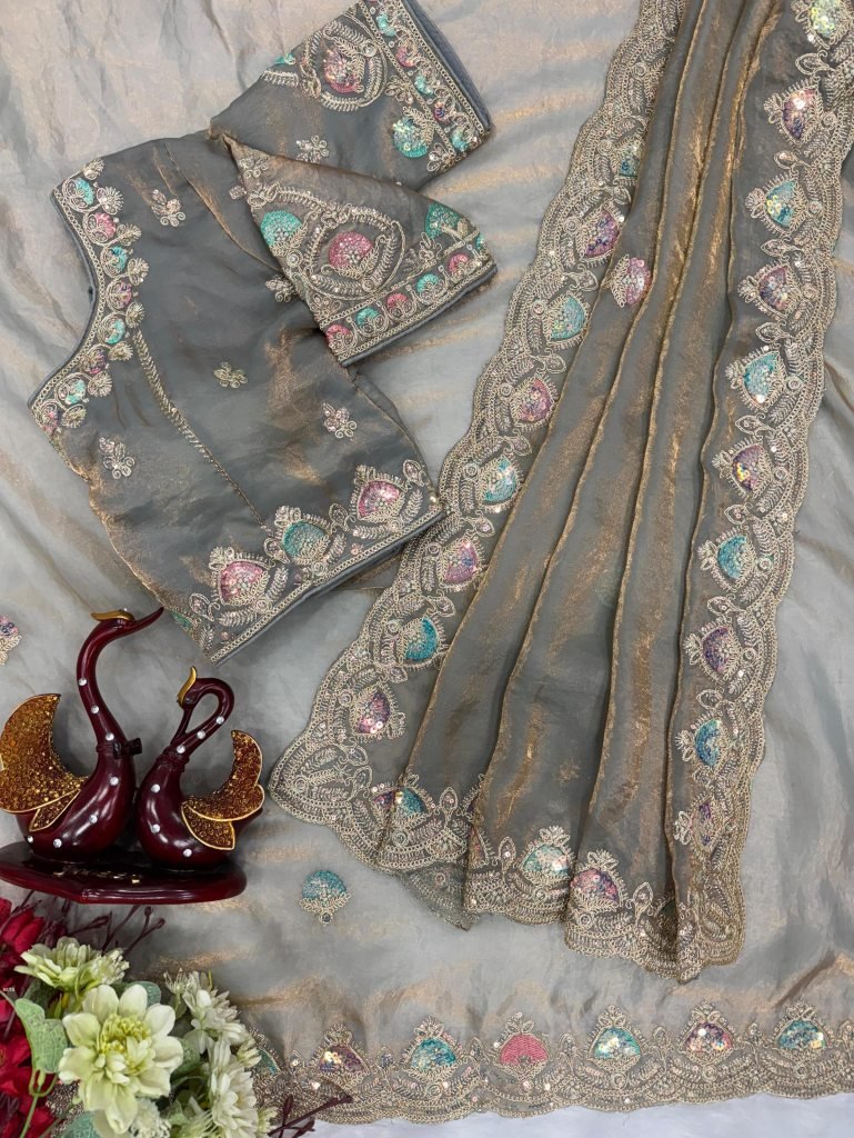 Drape yourself in elegance with this exquisite Soft Space Silk saree, crafted to radiate grace and sophistication. Adorned with dual-tone sequin and delicate dori embroidery work, the saree beautifully balances traditional artistry with a modern flair.