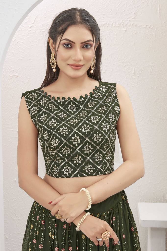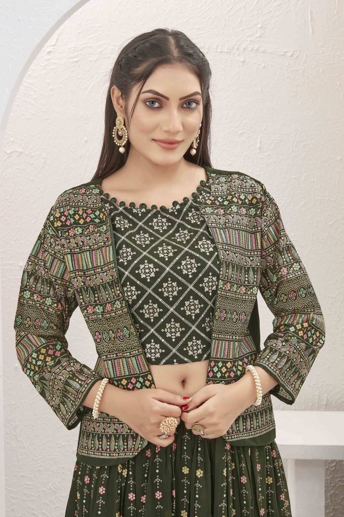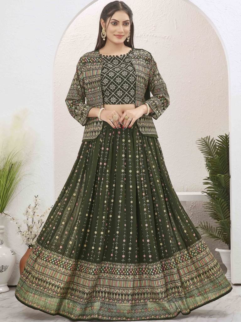 Beautiful Mehendi Green Georgette Lehenga with Shrug Jacket