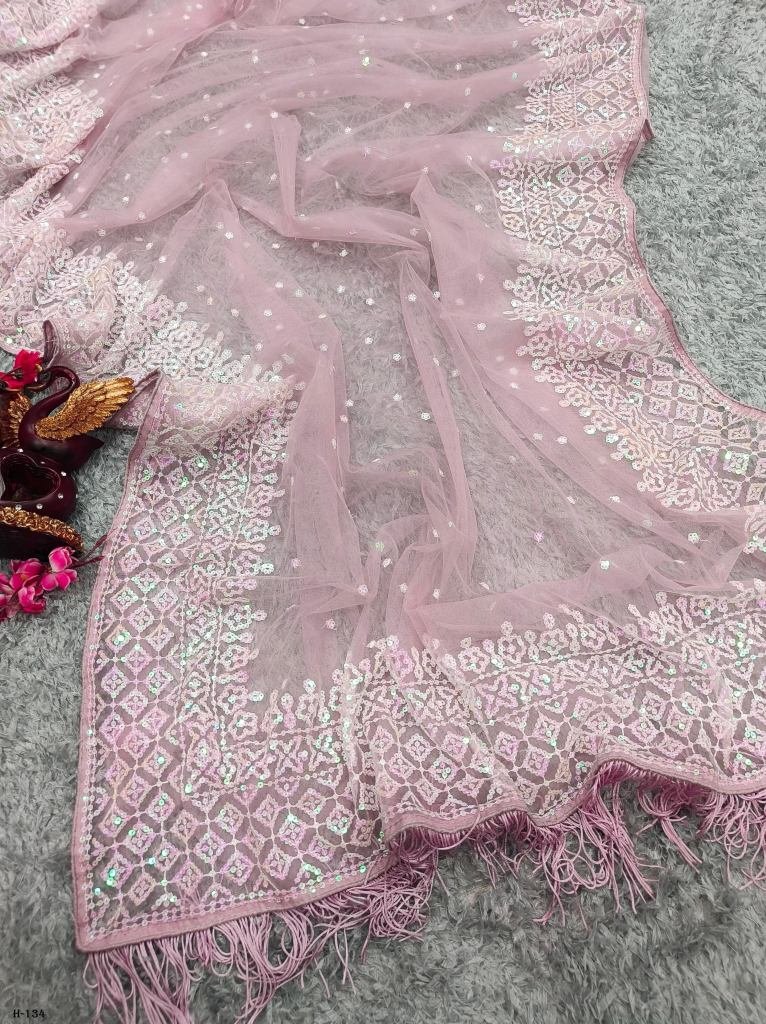 The ethereal looks resplendent in our pink soft net saree.