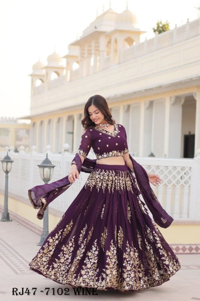 Shop This Trending Wine Embroidered Fully Flared Georgette Lehenga Made with Rich Sequins And Thread Embroidered Work With Stunning Blouse And Dupatta.