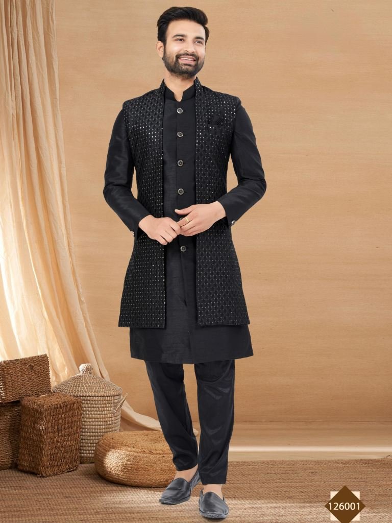 • Mens Black Embroidered Zari Work Kurta With Jacket