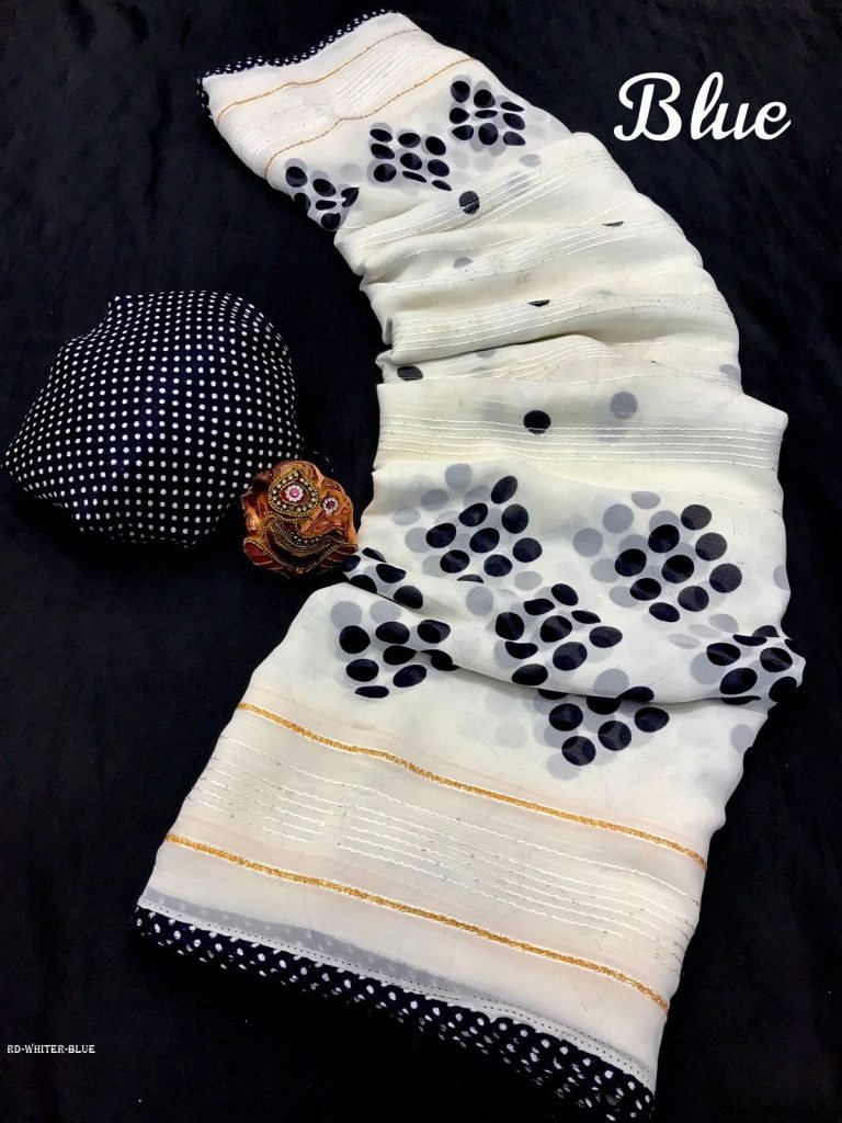 Attractive White Collection Fabric :- Fancy Soft Georgette digital print & sequence crochet saree with nice contrast lace border.Fabric :- Contrast Color matching.Four Fantastic Colors