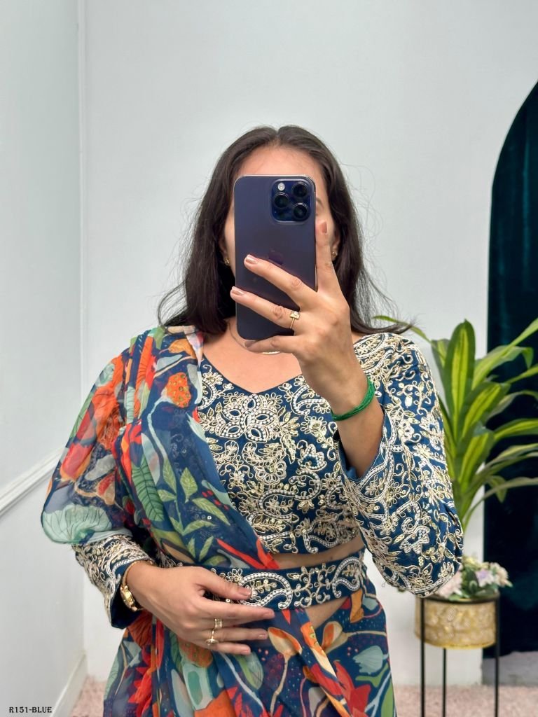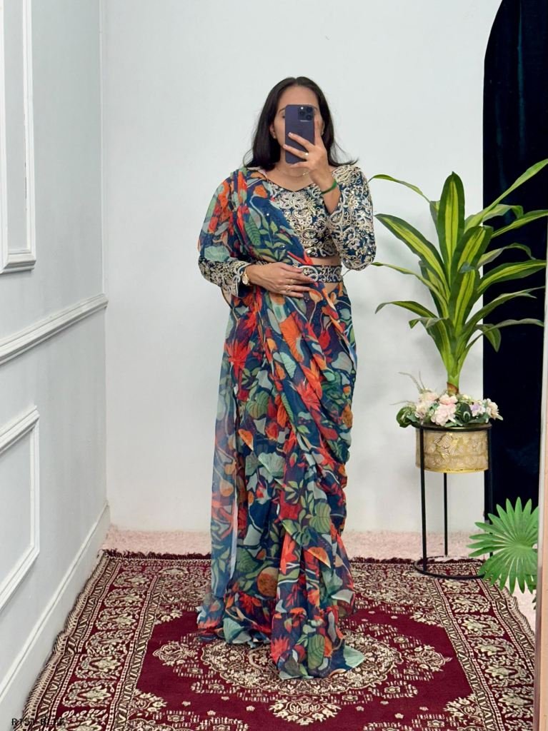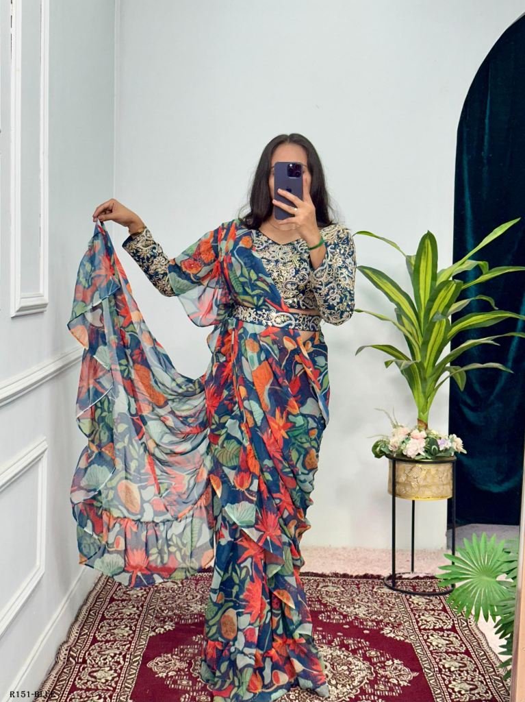 Saree DetailsFabric:- FAUX GEORGETTEWork:- DIGITAL PRINT AND RUFFLE BORDERBlouse DetailsFabric:- BANGLORYWork:- FULLY EMBROIDERED STITCHED BLOUSE UP TO 42 inchEMBROIDERED BELT AVAILABLE