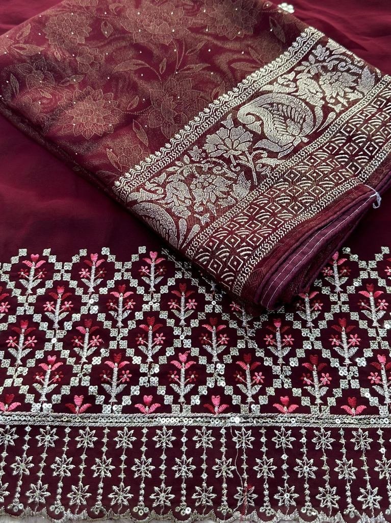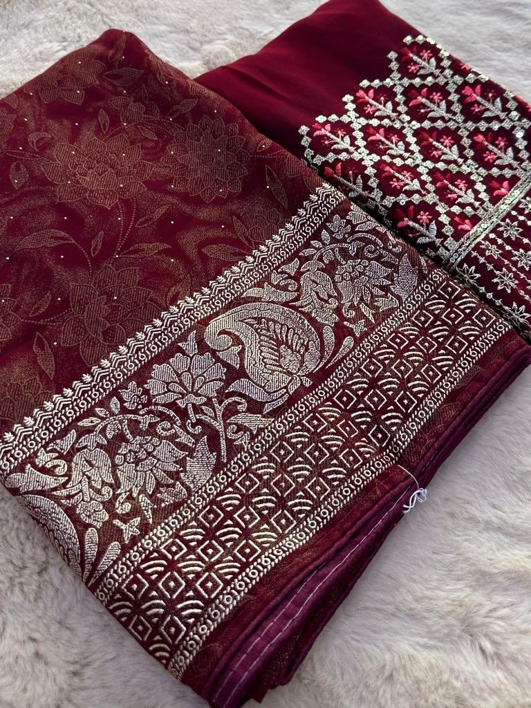 Fabric : Georgett fabric Work :- Additional Smoke work With beautiful leather foil with heavy tone to tone embroidary blouse.Saree cut :- 5/50Blouse piece: 0/80Occasion :- Wedding, Festival