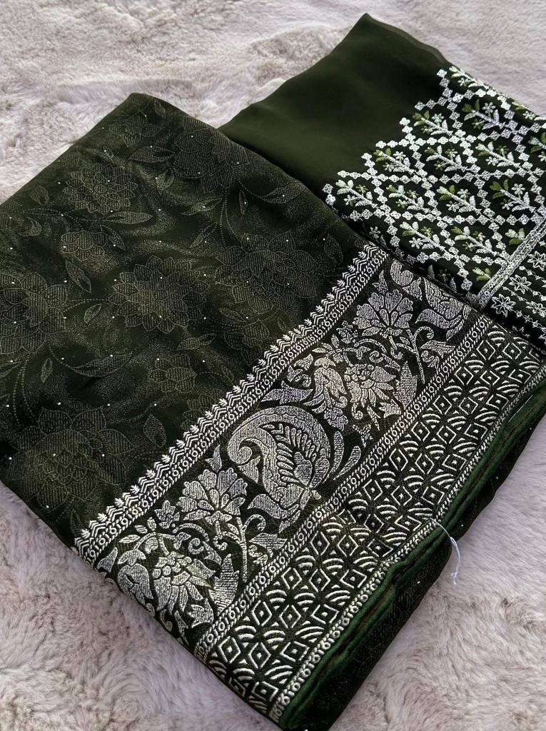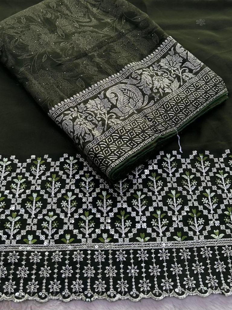 Dark Mehendi Designer Border Embroidered Georgette Saree With Heavy Unstitch Blouse