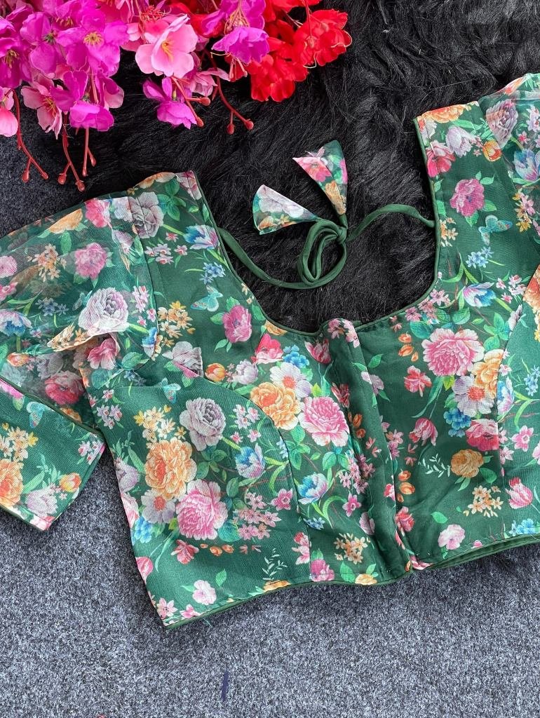 • Green Sobha Flower Printed Organza Readymade Blouse