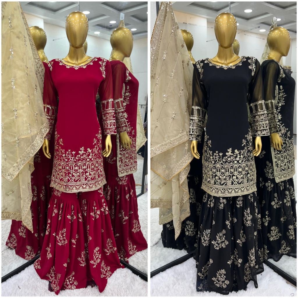 Plazzo Fabrics : Heavy Faux Georgette With 5mm Embroidery Sequence With Fully Flair