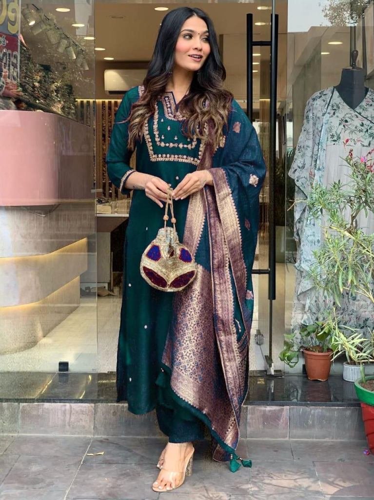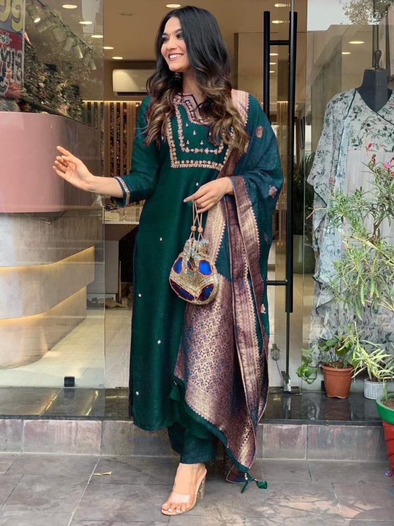 Fabric :- Viscose Roman Silk Duppatta Fabric :- Heavy Jacquard Work Weaving Chanderi With Full Zari WorkInclusive :- Top, Bottom & DupattaOccasion :- Wedding