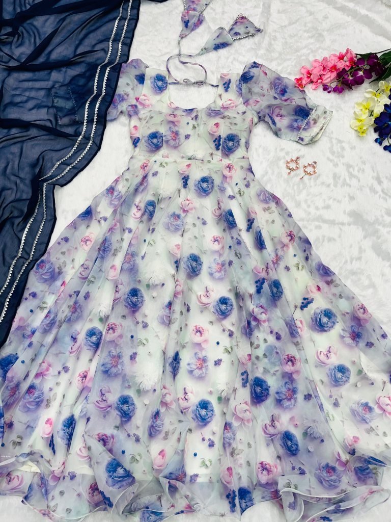 Anarkali Gown - Digital Printed Jimmy Choo Organza Silk Suit With 8mtr Huge Flair Dupatta Stylish 2mtr Georgette Dupatta Fully stitched Size - 36, 38, 40, 42 margin given for 44
