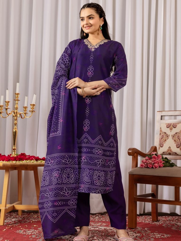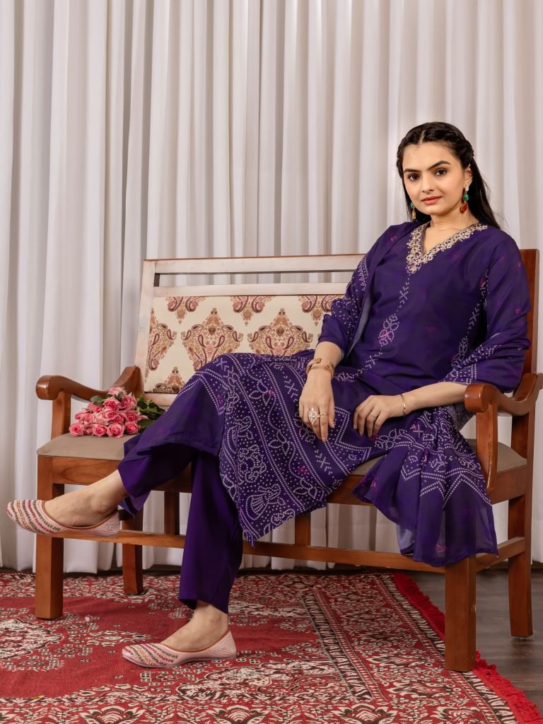 Bandhani Printed Muslin Silk Kurta Pant And Dupatta Set With Heavy Handwork Detailing On Yoke