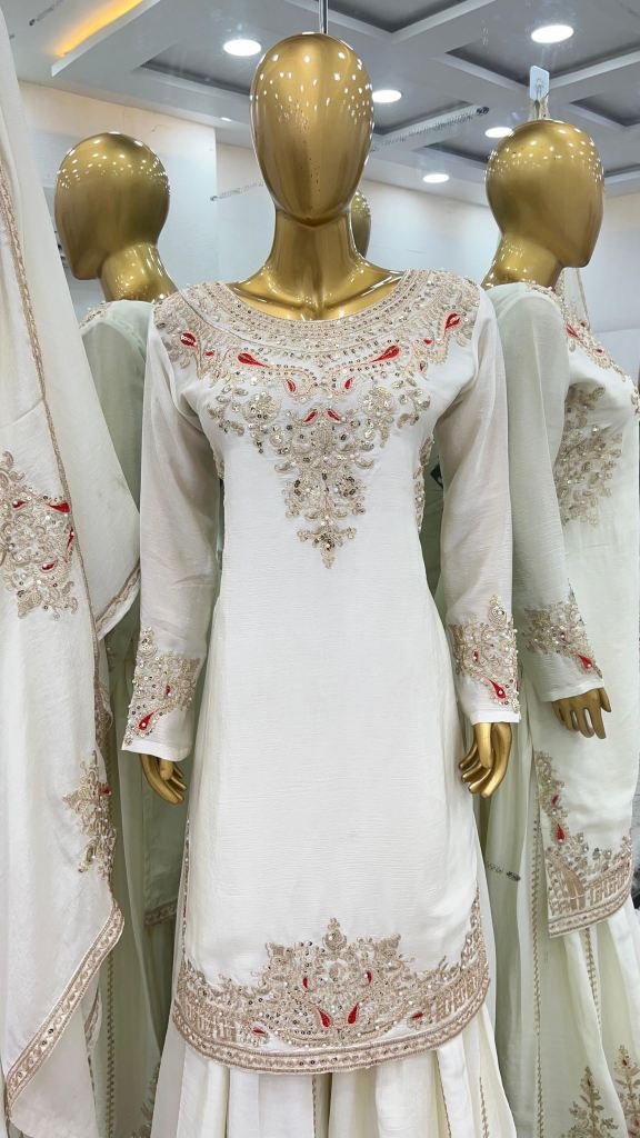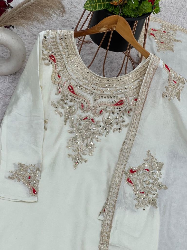 Embroidery Sequence Work White Palazzo Suit