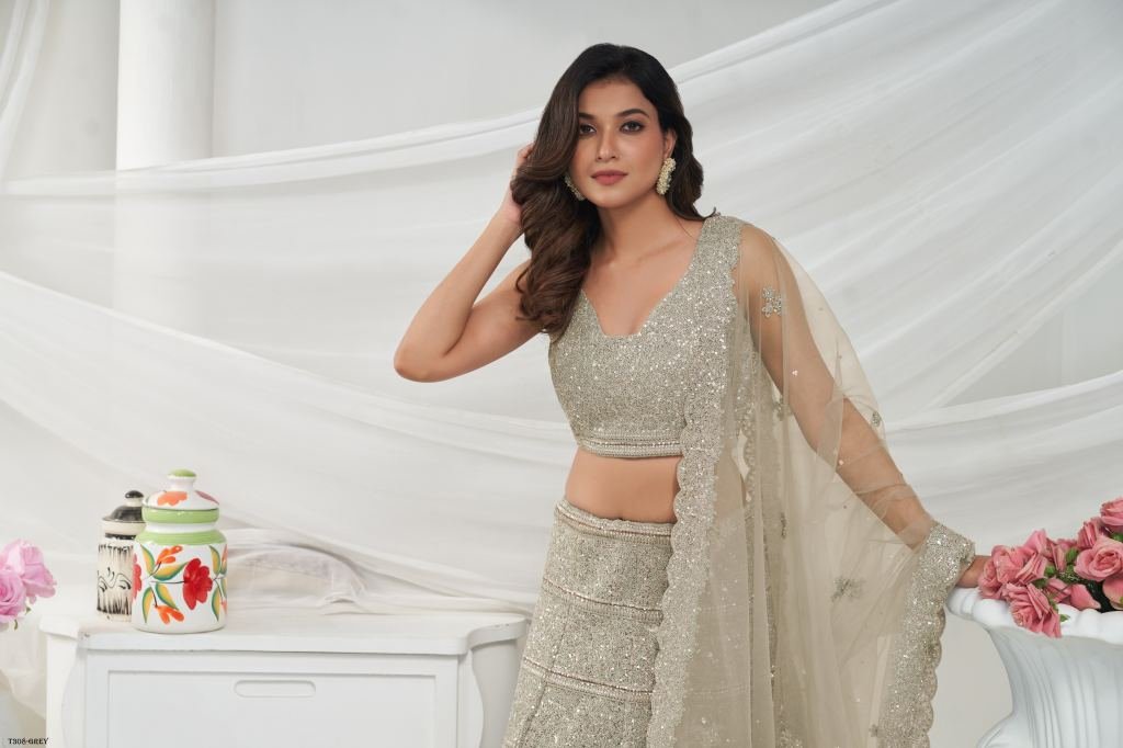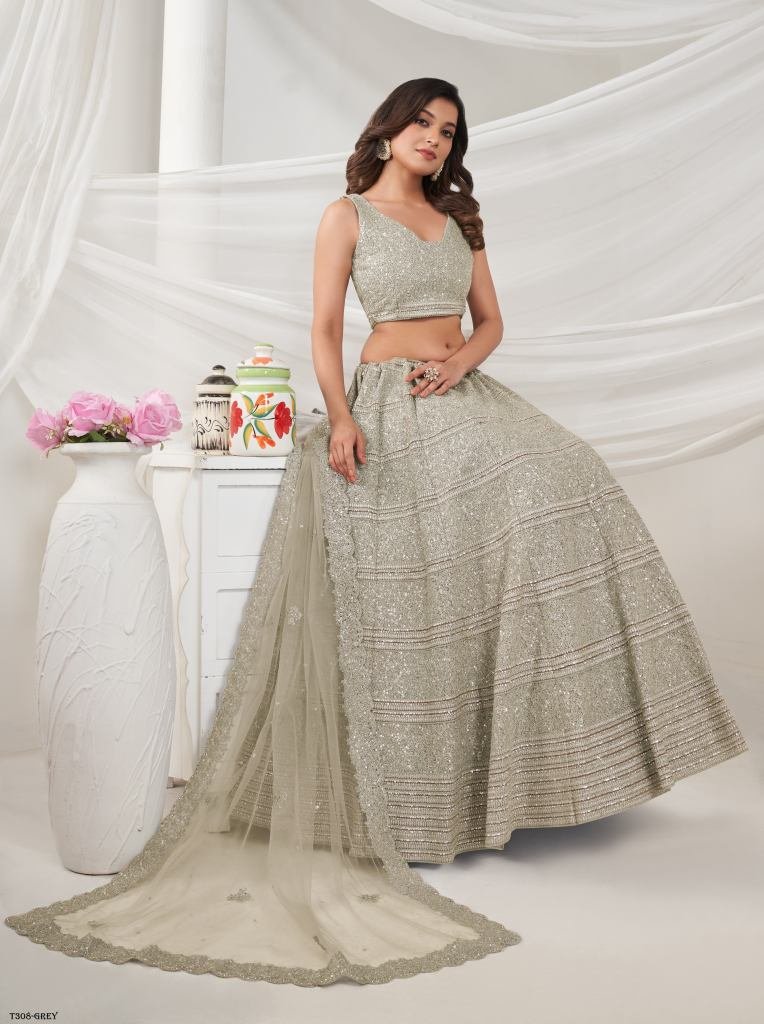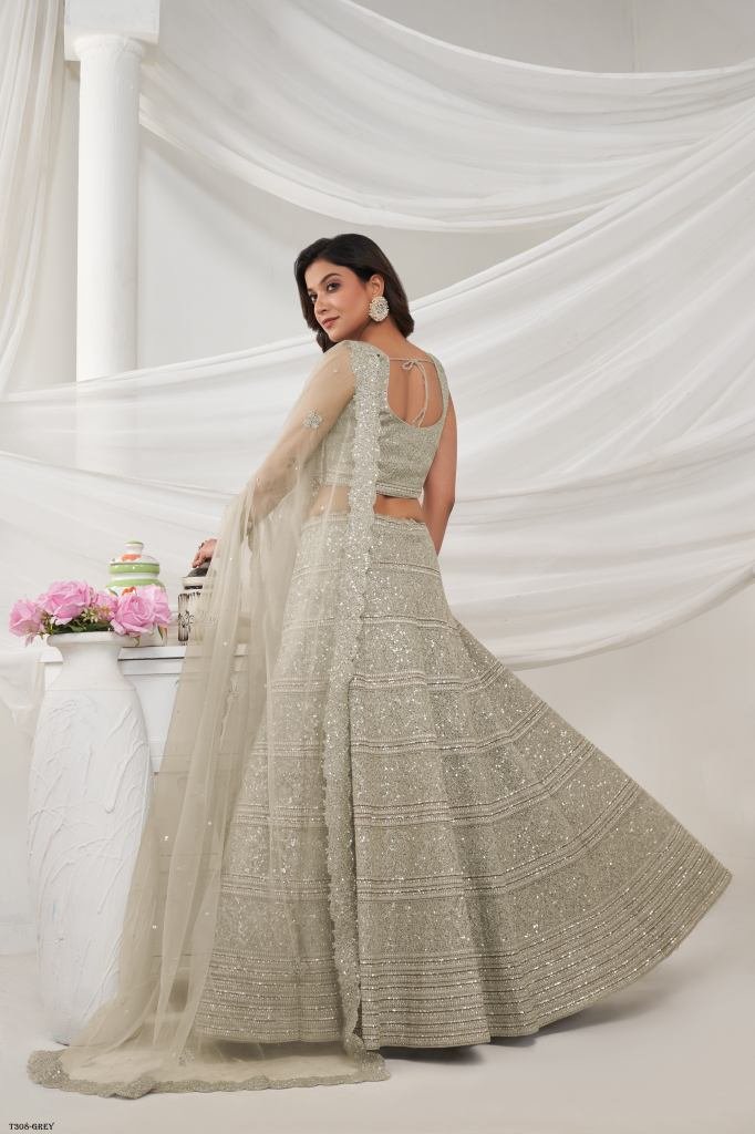 A Off White lehenga with horizontal sequin and thread work embellished with shimmering stones. The embroidered net dupatta and blouse, accentuated with stone work on the border.
