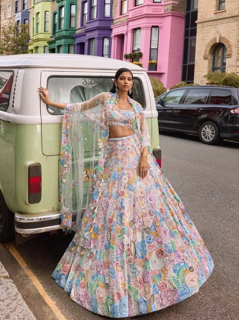 Lehengas work : heavy embroidered sequnce work with 3 mtr flair can-vas, can- can