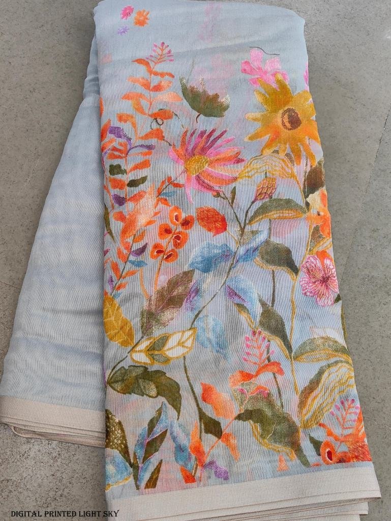 This silk linen feel has created a wonderful digital print. It’s jari border on both the sides gives a pure touch to it
