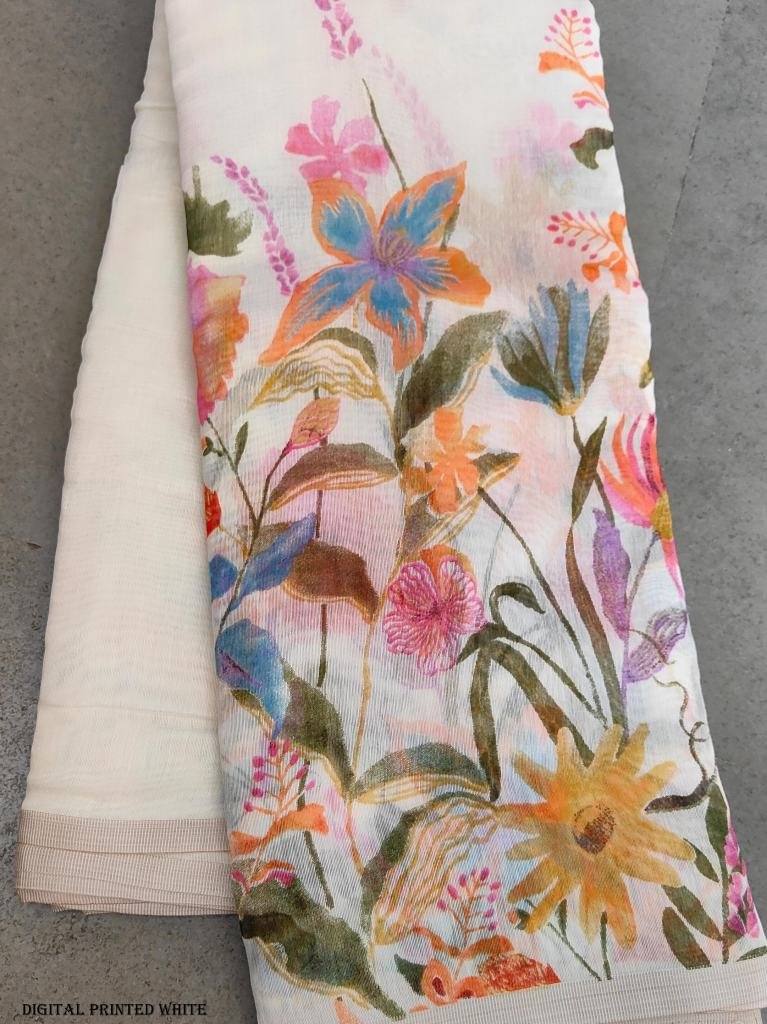 This silk linen feel has created a wonderful digital print. It’s jari border on both the sides gives a pure touch to it