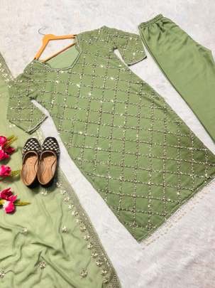 • Fancy Georgette Sequence Embroidered Mehendi Color Kurti Pant With Dupatta