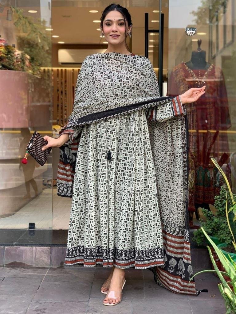 Pattern :- Hand-block print kurti setFabric :- Primium 60-60 cottonType :- kurti+pant+dupatta Occasion :- Festival Wear