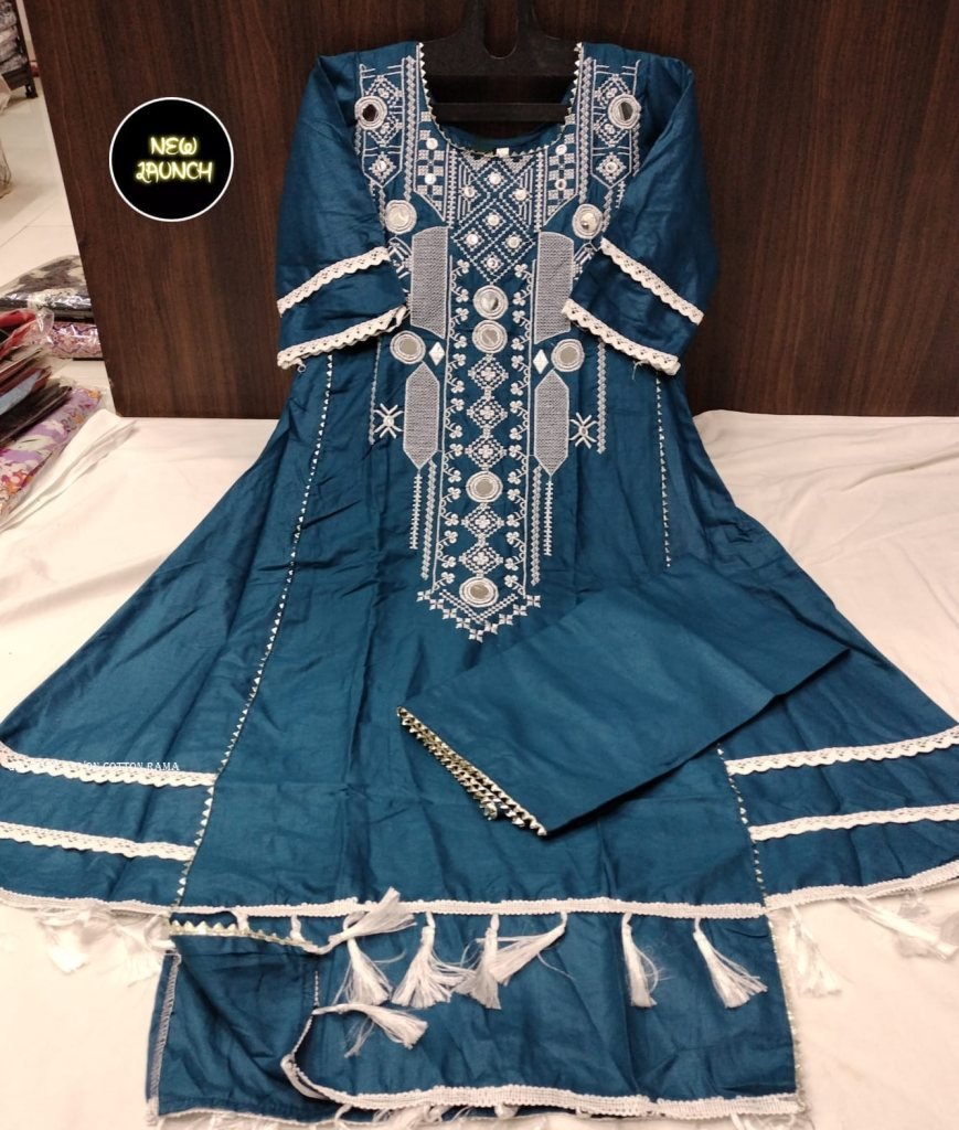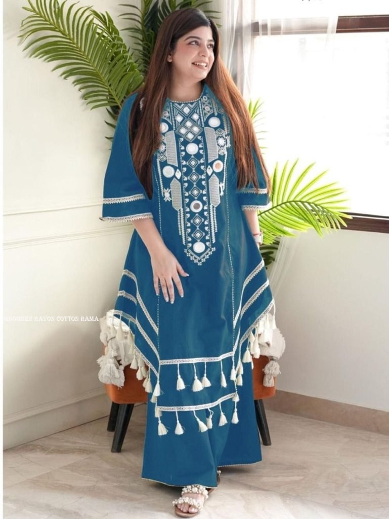Top : Beautiful Heavy Rayon cotton with heavy Embroidery work in neck with original mirror with stylish lace and cutBottom : Pure rayon cottonLENGTH :- 45+SIZE - M,L,XL,XXL