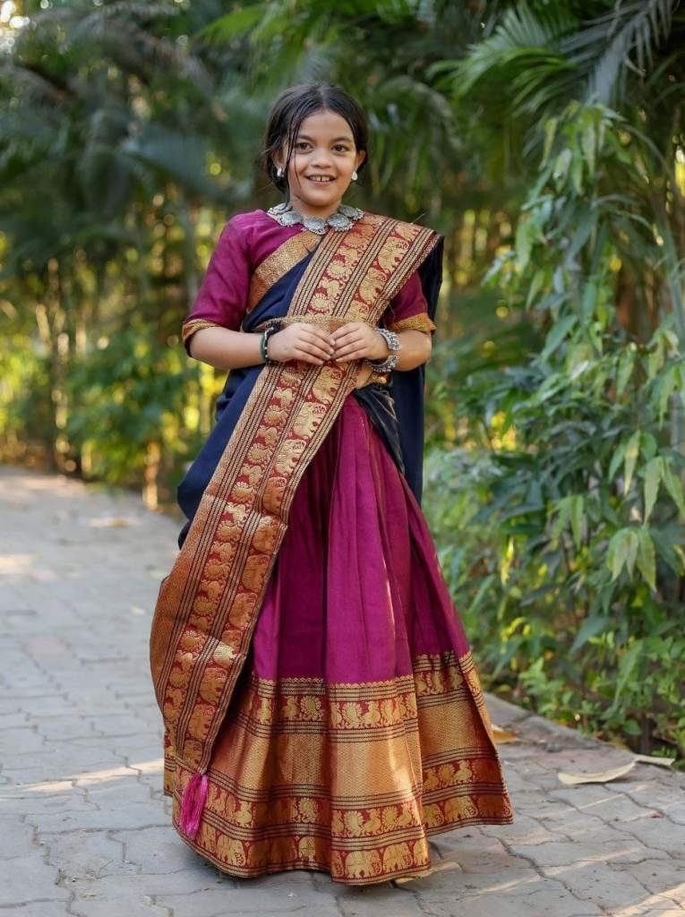 Your little girl will steal the show in this best-selling soft Narayanpet silk kids lehenga choli paired with a heavy jacquard dupatta and designer belt - a perfect outfit for any special occasion.