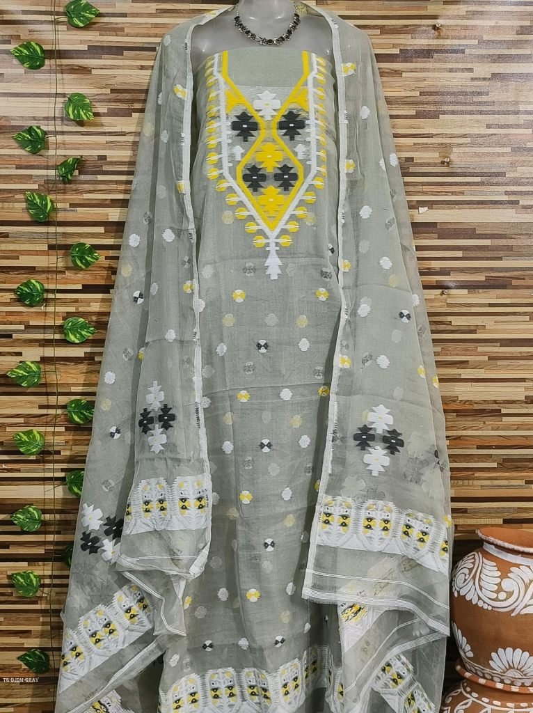 Dhakai JamdaniMost demanding productjamdani suits 2 pcsFabric :- JamdaniTop Meter :- 2.5 MeterDupatta :- 2.5 MeterColor :- GrayOccasion :- Wedding, Festival, Regular, Function,