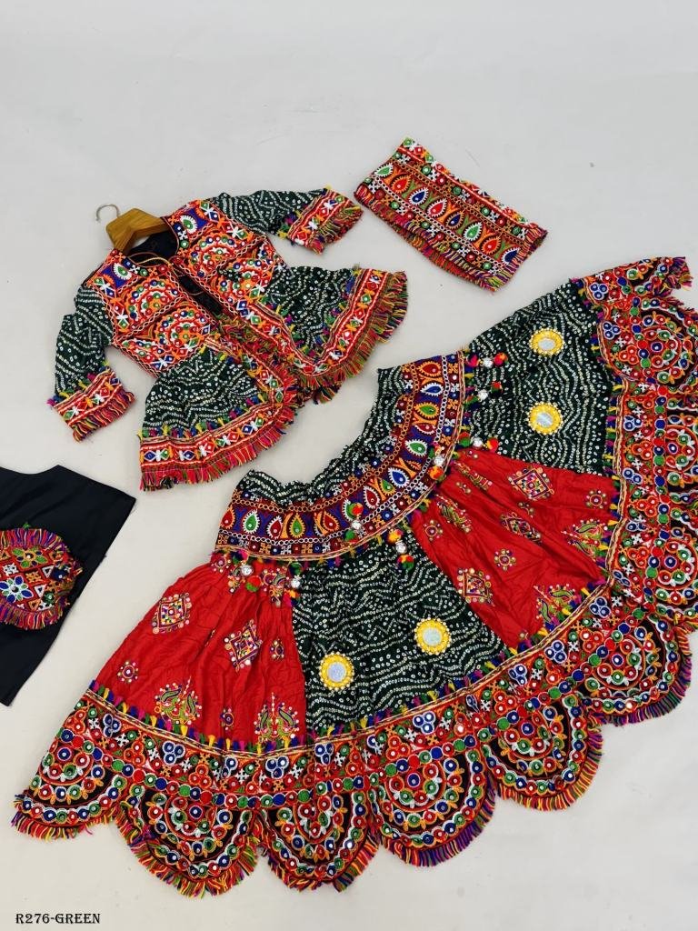 Green Navratri Traditional 4PC Kids Lehenga Set With Kedia And Cap