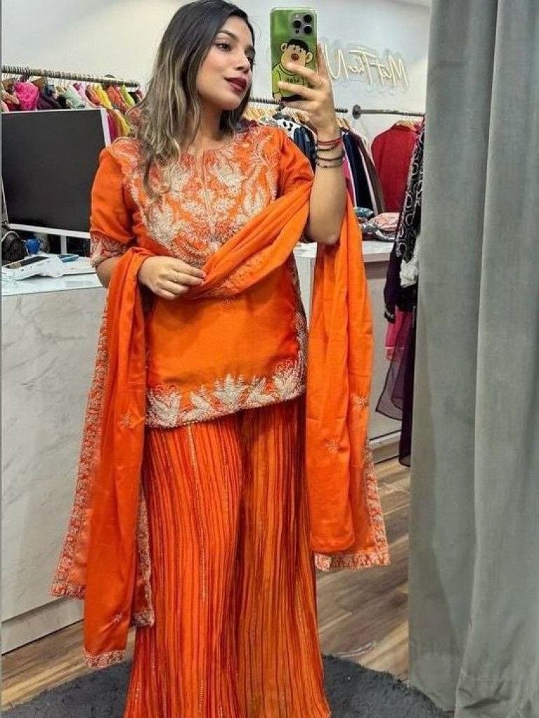 Sharara fabric :Pure Heavy Chinon Silk With Heavy Embroidery Coding Sequence Work (FullyStitched)