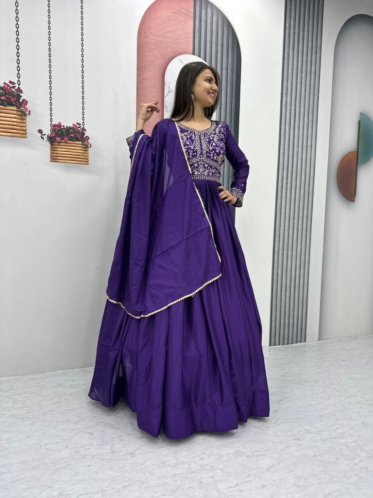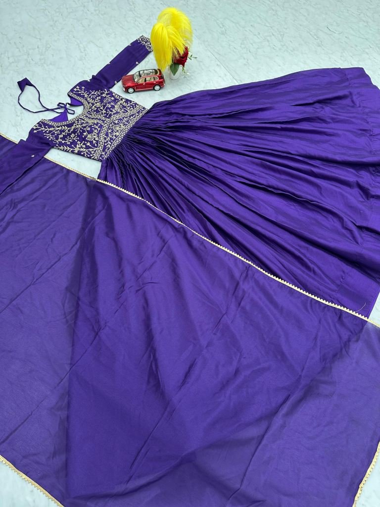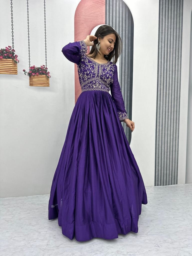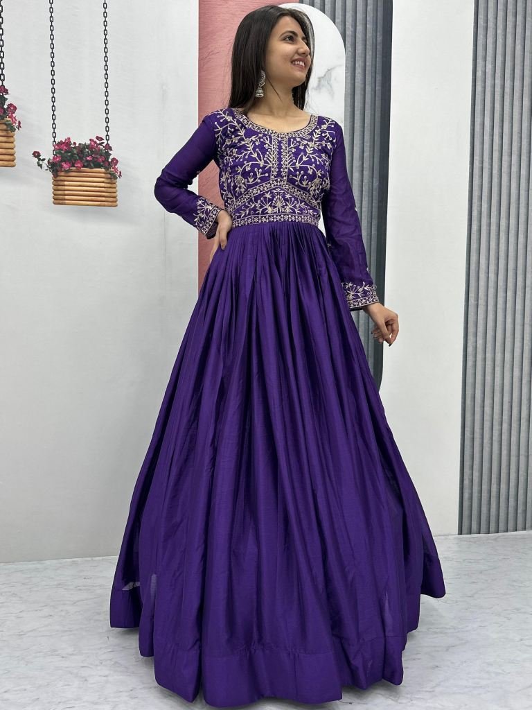 Fabric:- ChinonWork:- Heavy Embroidery Thread & Sequence WorkInner:- Micro CottonFlair:- 3 MeterLength:- 55/56Size:- M up to L margin XL up to 2xl margin (Fully Stitched)