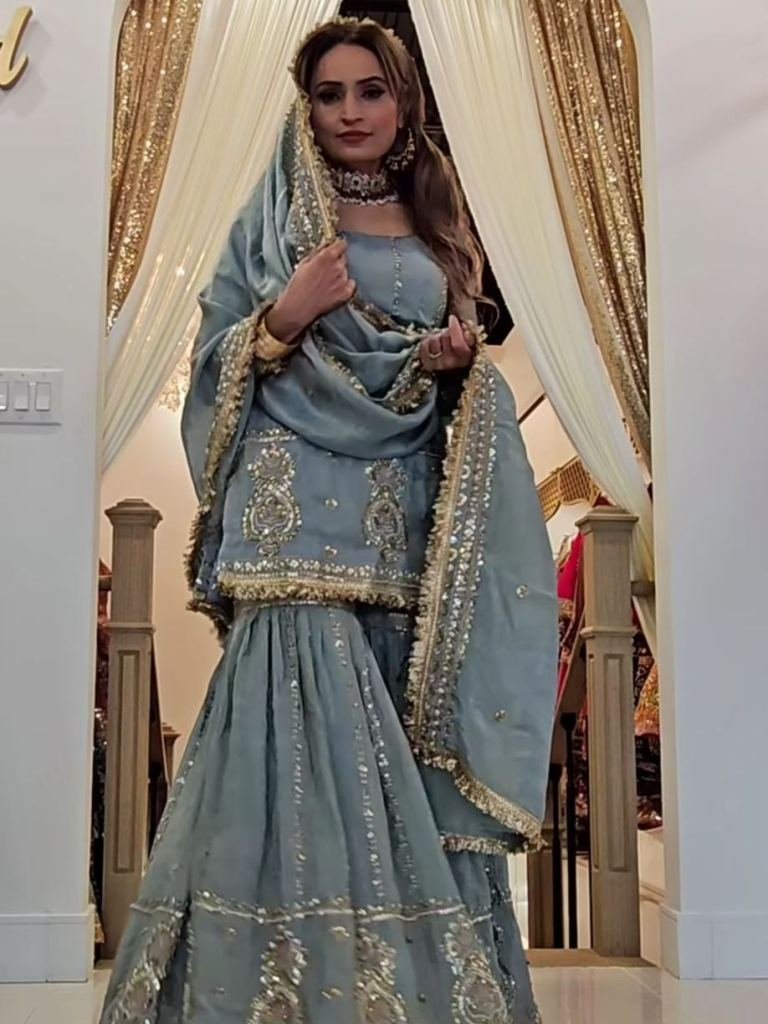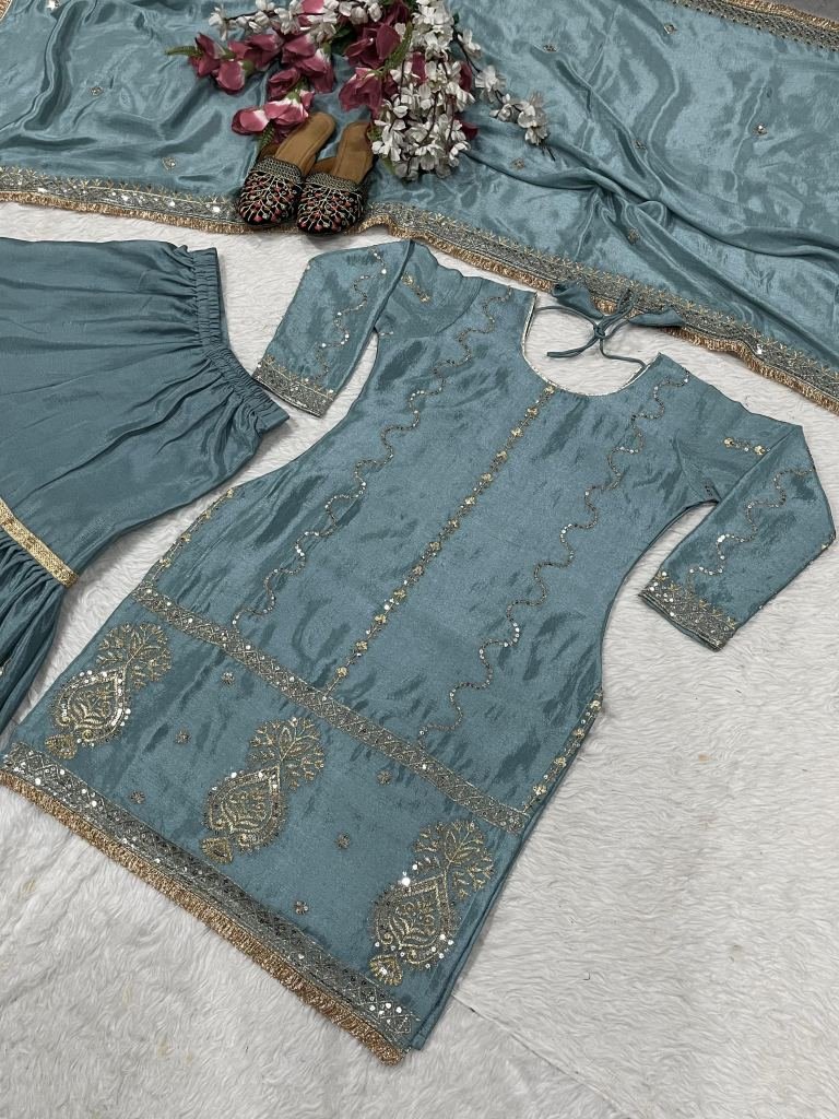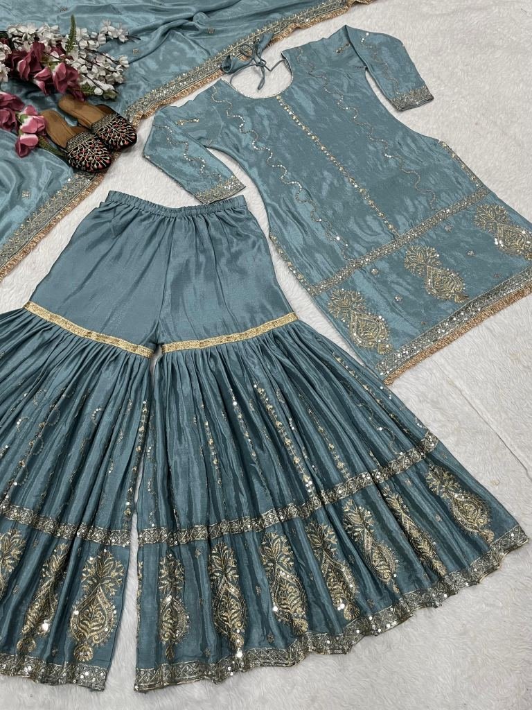 Top Fabric :- Chinon Silk With Heavy Embroidery Work With Fancy Borders Less Work Sleeve With Fancy Latkan Dori.
