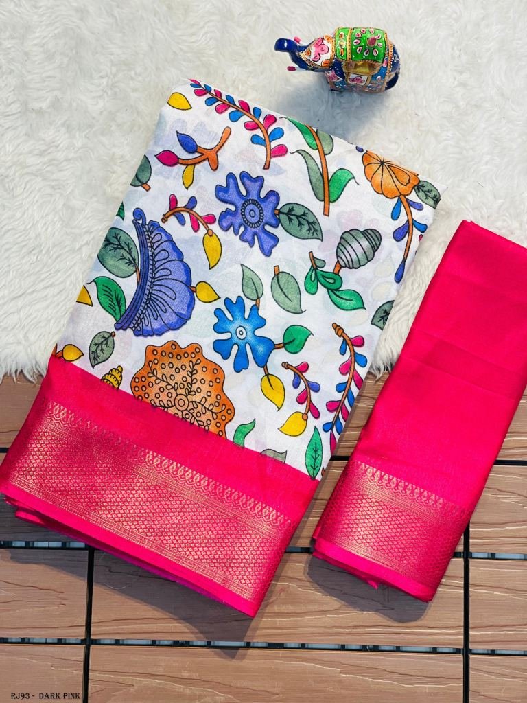 Very Exclusive Handloom Silk Called Kanchi Border Dola Silk Fabric With Kalamkari Printing Sarees With Zari Weaving Pattu Border With Jari Chex Pallu & Attached Blouse