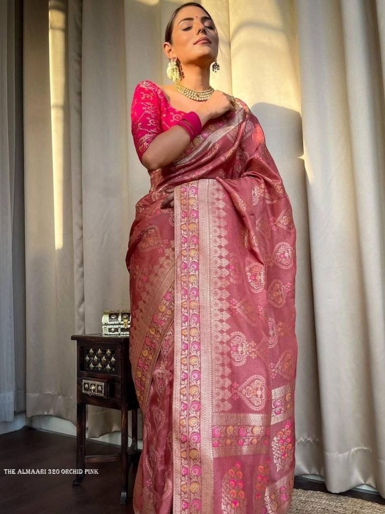 Fabric :- Banarasi Soft SilkSaree Length :- 5.5 MeterBlouse Length :- 0.8 MeterPURE BANARASI COPPER ZARI WEAVINGSTUNNING ORCHID PINK SAREE WITH HEAVY BROCADE BLOUSE