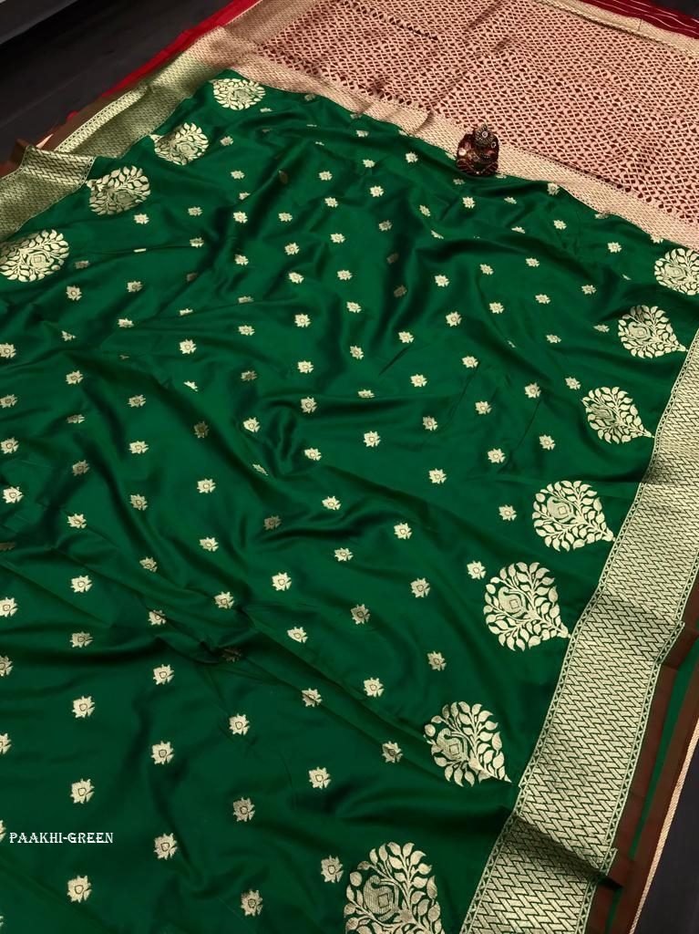 Fabric : SUPER SOFT BANARASI SILK SAREE WITH WEAVING ROSE GOLD JARI AND CONTRAST REACH PALLUBLOUSE : COTRAST WEAVING BLOUSE WITH JARI BELTColor :- GreenWe believe in Quality