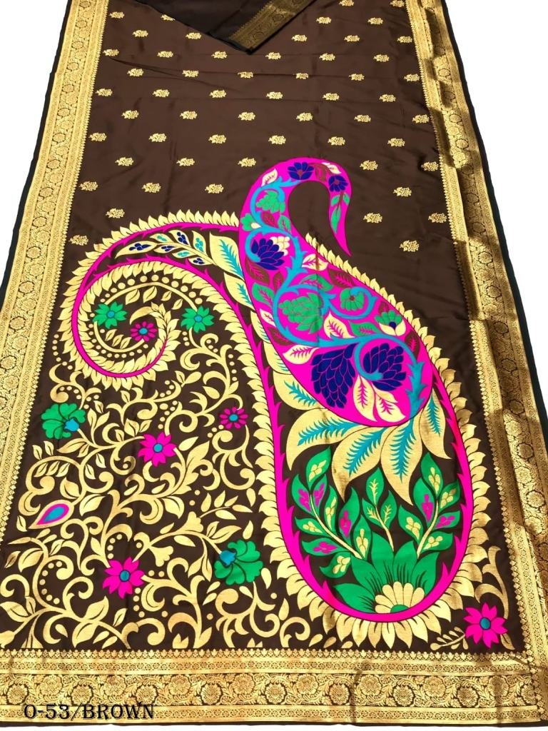 fabric : soft banarasi lichi silk attractive color combination with rose gold jari super border and nicely weaving work with rich look big pallu
