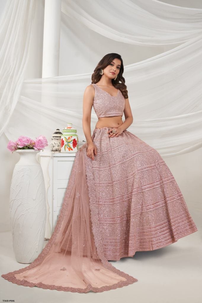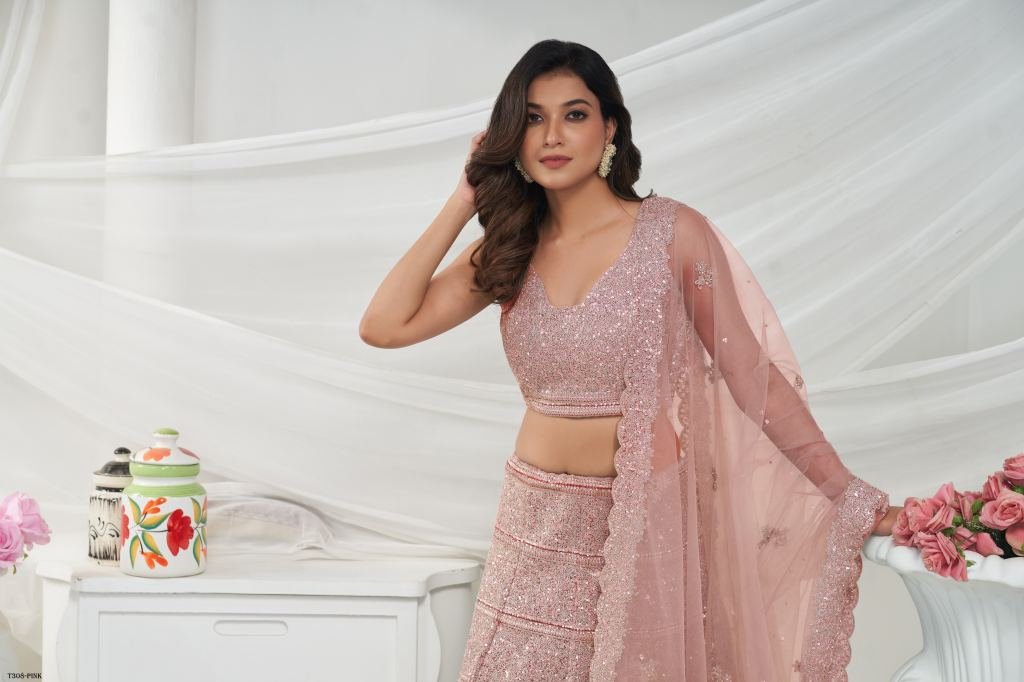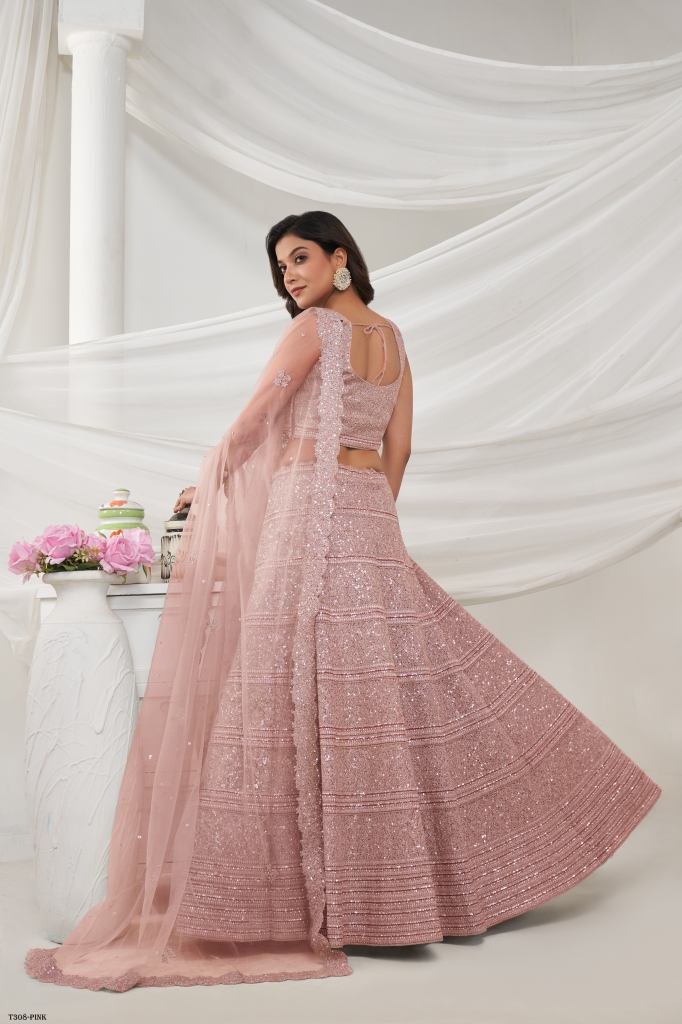 A Pink lehenga with horizontal sequin and thread work embellished with shimmering stones. The embroidered net dupatta and blouse, accentuated with stone work on the border.
