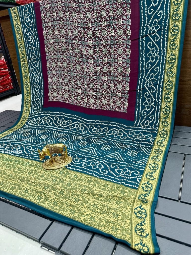 Soft Modal Silk Saree With Beautiful Ajrakh~ Bandhani Print Pallu & Border Saree