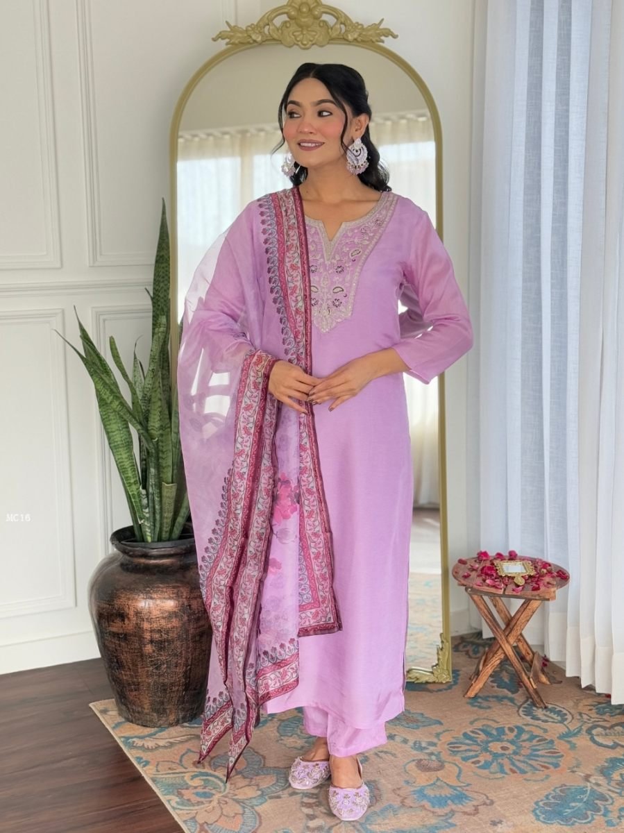 This is a three piece ethnic set featuring a straight fit kurta, matching rayon pants, and a printed dupatta. The kurta is crafted from soft rayon fabric and enhanced with embroidery work, offering a comfortable and elegant look suitable for daily wear as well as casual occasions. The bottom is also made from rayon fabric for a coordinated finish. The set is completed with a taby fabric dupatta featuring printed design and a length of 2.10 meters.