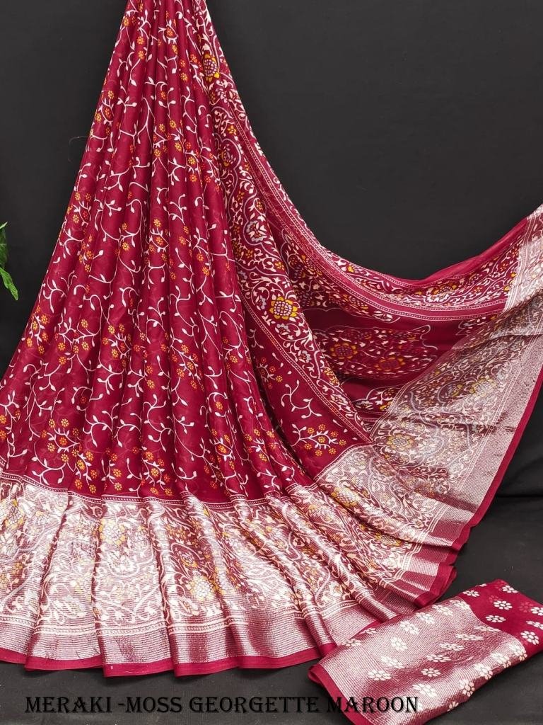 Beautiful light weight pure moss Georgette sarees with allover bandhani with flower design along with pure viscose border design border flower pallu