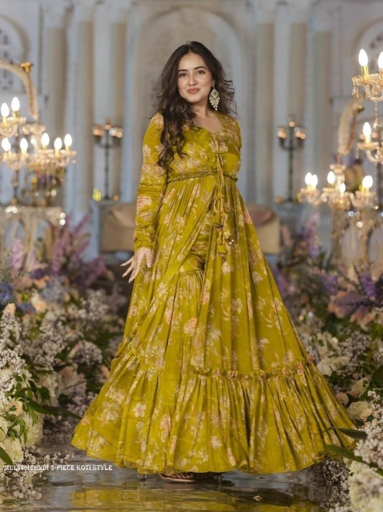 Introducing this stunning 3-piece Koti Style Indo-Western Suit of printed crop top, Sharara and parallels paired with a beautiful printed shrug set collection (set of 4 beautiful design 101 to 104)