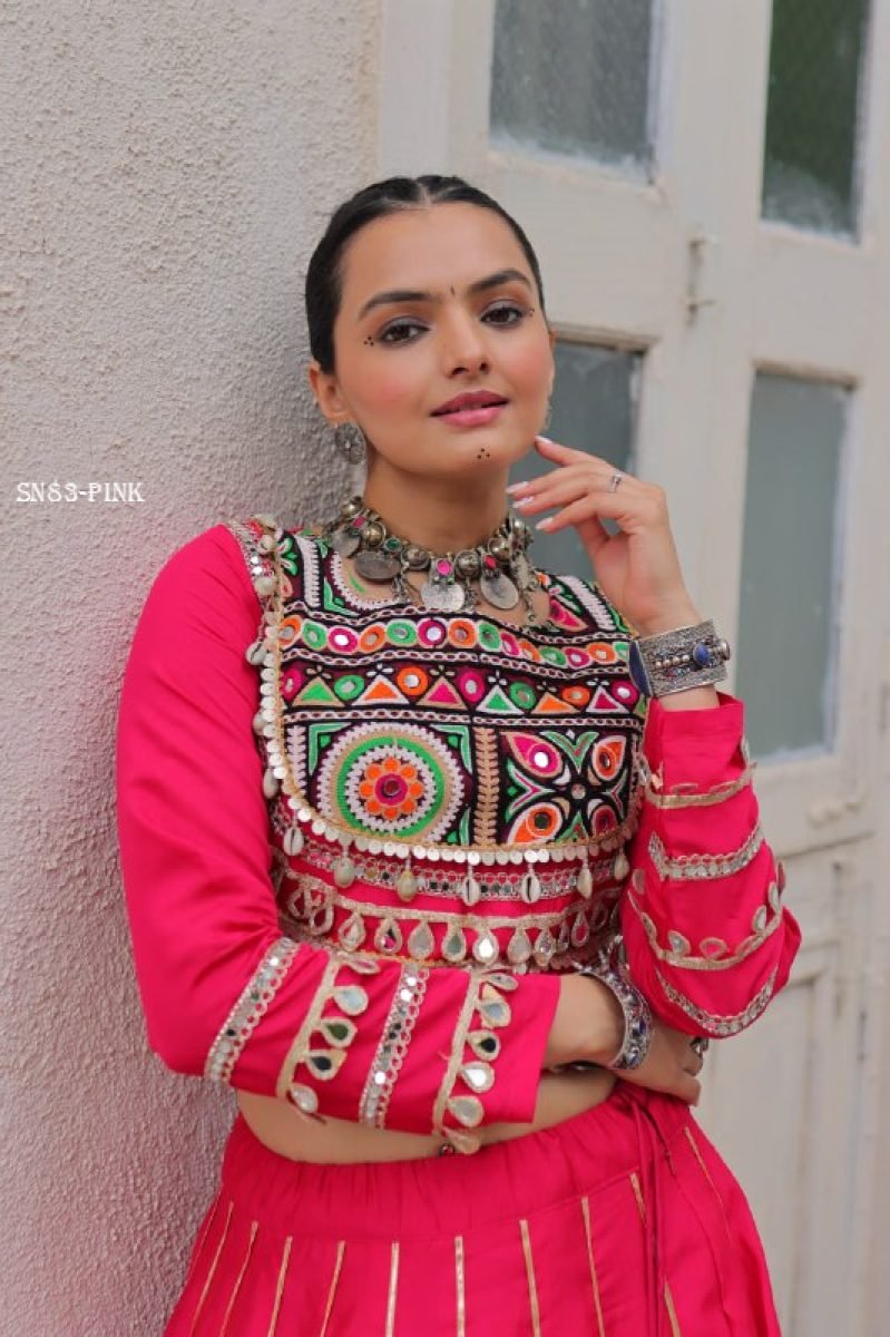 Fabrics & Work :- Roman Fabric With Kutchi Gamthi Embroidered Work And Mirror Lace Work