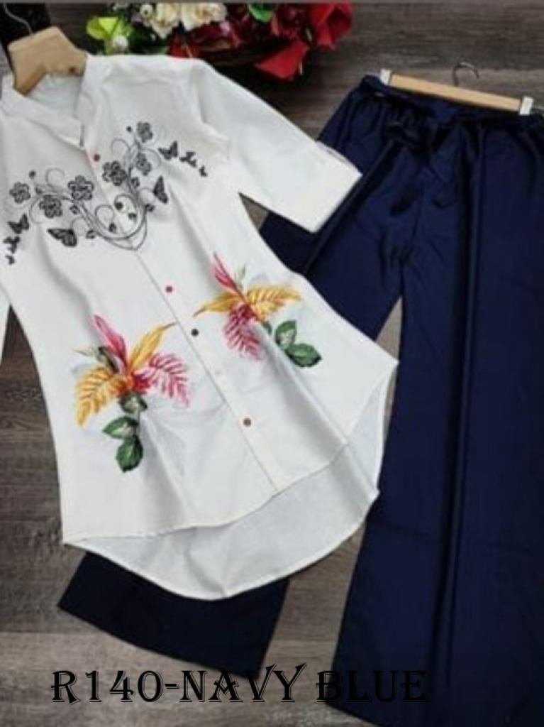 TOP :-Top Fabric :- COTTON PRINT Top Length:-front 31" Inch, back 35"PLAZO :-HEAVY AMERICAN CREAPPlazo Length:- 38+”Inch Full Stitched Readymade