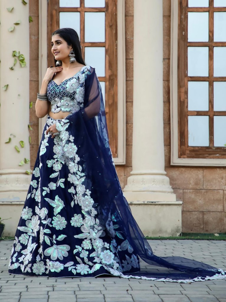 Navy Blue Kasturi Silk georgette lehenga with rainbow sequins & Dori work