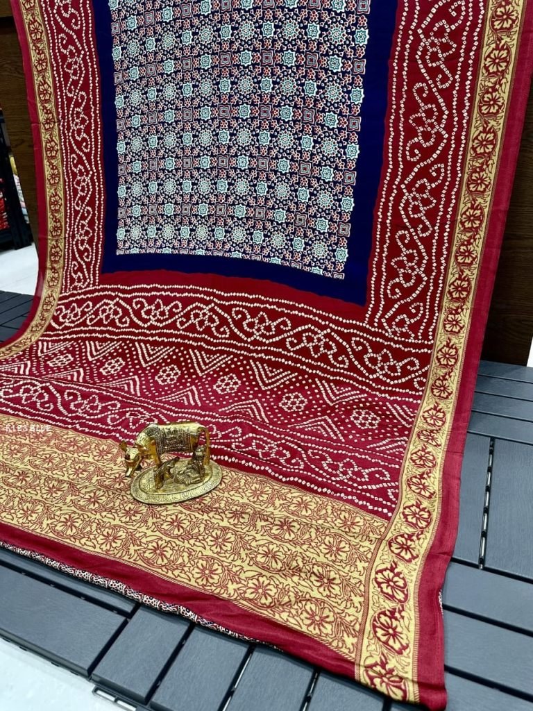 Soft Modal Silk Saree With Beautiful Ajrakh~ Bandhani Print Pallu & Border Saree